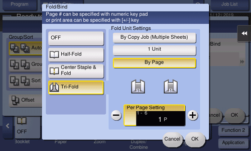 Folds copied sheets in three before feeding out. Also select the unit by which the paper is folded from [By Copy Job (Multiple Sheets)], [1 Unit], and [By Page]. When you set [By Page], specify the number of pages to be folded at one time.
