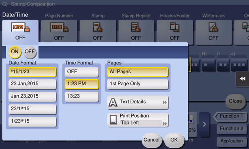 [ON]/[OFF] | Select [ON] to add the date/time. |