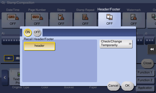 [Check/Change Temporarily] | If necessary, check or temporarily change the details of the program that is selected in [Recall Header/Footer].