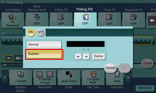 Tap [Bulletin], enter the number of the Bulletin Board User Box in the receiving machine, and tap [OK].