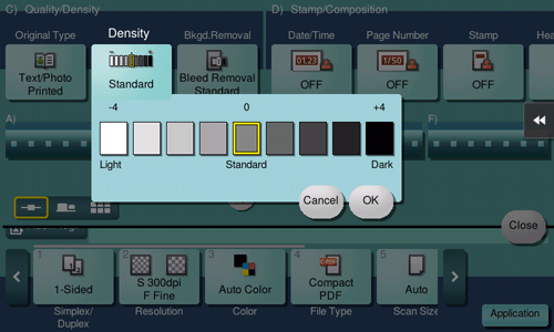 [Background Removal Level] | Adjusts the density of the background color for an original with a colored background. Selecting [Auto] automatically determines the density of the background color, and scans an original at the optimum background density level. |