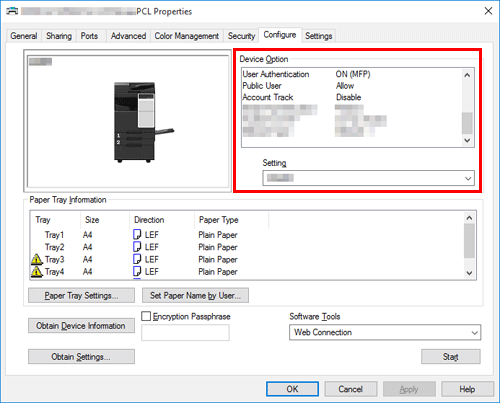 In [Device Option] in the [Configure] tab, check that the User Authentication/Account Track setting is correctly configured for your operating environment.