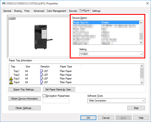 In [Device Option] in the [Configure] tab, check that the [User Authentication] and [Single Sign-On] settings are correctly configured for your operating environment.