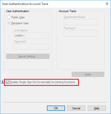 Check [Enable Single Sign-On functionality for printing functions] box, and click [OK].
