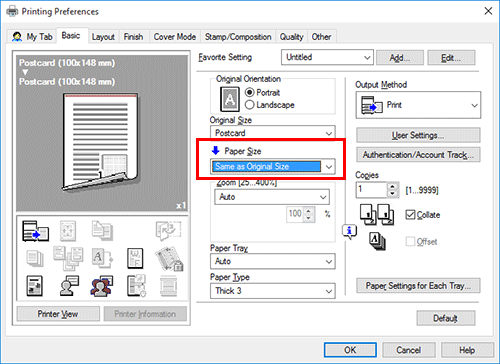 In [Paper Size] in the [Basic] tab, select the size of paper for printing. The zoom ratio is automatically determined by the paper sizes selected in [Original Size] and [Paper Size].