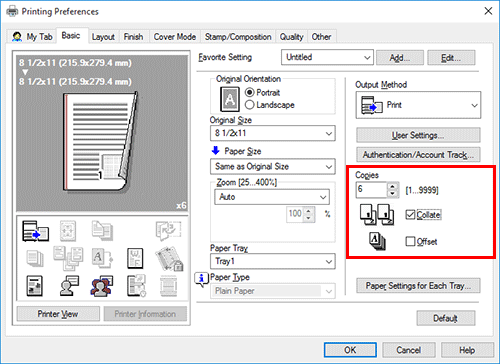 When the [Collate] check box on the [Basic] tab is selected, copies are output separately in a set-by-set manner, for example, "Pages 1, 2, 3, 4, and 5", "Pages 1, 2, 3, 4, and 5", and then "Pages 1, 2, 3, 4, and 5". When the [Offset] check box is selected, the output position is staggered one by one.