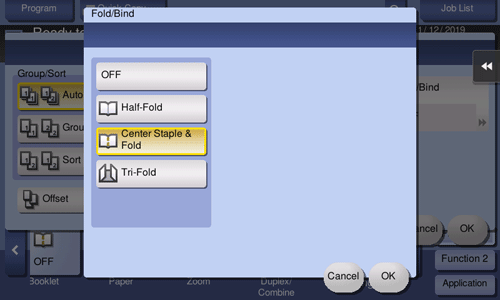 [Fold/Bind] | Staples copy outputs in the center the paper or fold them in the center before discharging.
