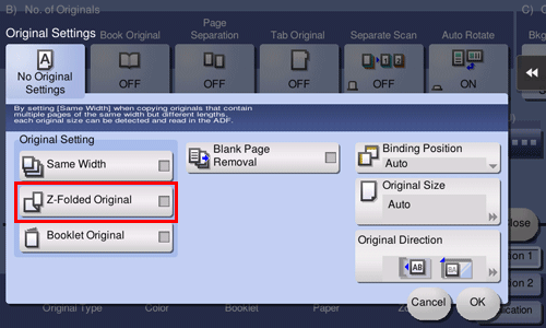 If a folded original is loaded into the ADF, the original size may not be able be detected accurately. When [Z-Folded Original] is specified, the original size can be accurately detected even for the folded original sheets.