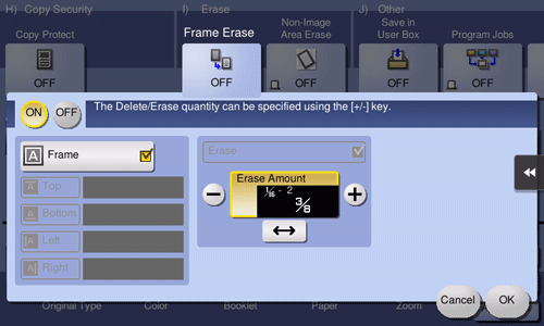 [Top]/[Bottom]/[Left]/[Right] | Specify a different width for each side of the original to erase the side. Cancel the [Frame] setting, select the side to erase the frame, and specify the width to erase in [Erase Amount]. If you do not want to erase the side, cancel the setting for [Erase]. |