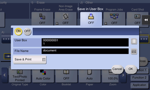 Saves original images in the User Box of this machine. You can also save an original in a User Box and print at the same time.