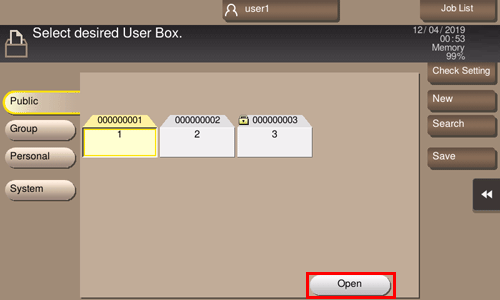 • You can tap [New] to create a new User Box. For details, refer to Here.