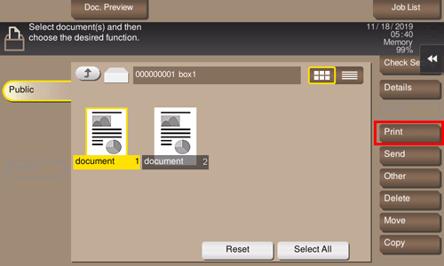 • This example uses the Public User Box for explanatory purposes. To use a Personal User Box or a Group User Box, tap [Personal] or [Group], and select the desired User Box.
