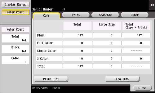 The Eco Info function automatically calculates the ratio of color print jobs to all print jobs, the ratio of paper saving by two-sided printing or page combine function, and a transition of power consumption based on the usage of this machine, all of which enables you to check the resulting eco information. You can review the operation method of this machine based on eco information to develop an awareness of costs and work to reduce costs.