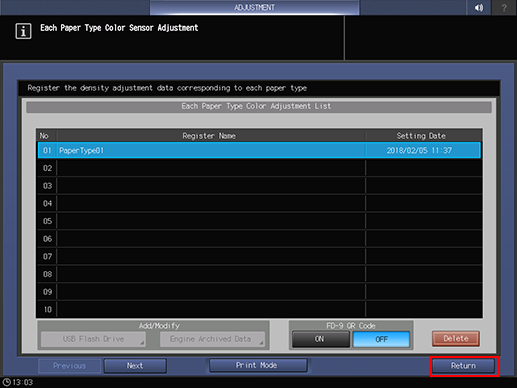 The screen returns to the Each Paper Type Color Adjustment List screen.