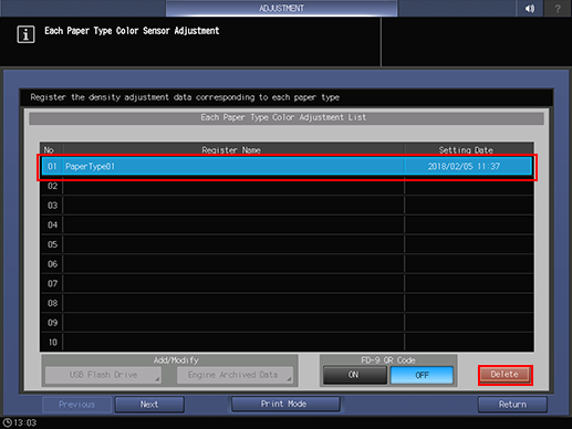 Select a row you wish to delete from Each Paper Type Color Adjustment List, and press Delete.