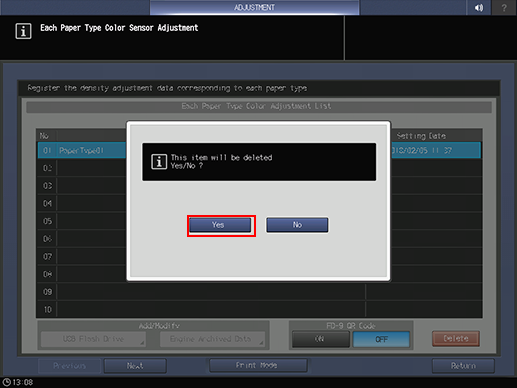Once you have deleted the color sensor adjustment data for each paper type, you cannot recover it. Please be careful in deletion.