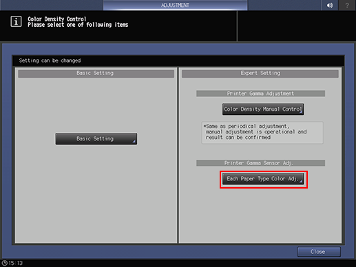 Press Each Paper Type Color Adj. on the Color Density Control screen to display the Each Paper Type Color Adjustment List screen.
