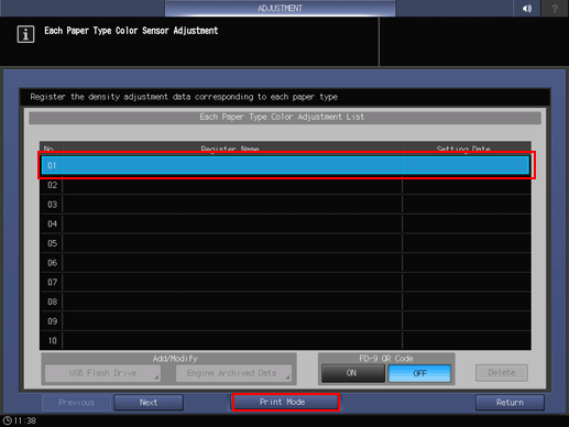 Select any row from Each Paper Type Color Adjustment List, and press Print Mode.