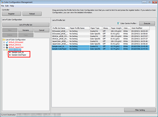 Example: In this example, two profile sets, Sample-coat-GL for coated GL and Sample_ColorPaper for colored paper, are registered.