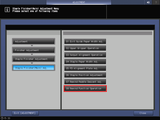 Press Finisher Adjustment, Staple Finisher Adjustment, Staple Finisher(Main) Adj., and Rewind Function Operation in sequence.