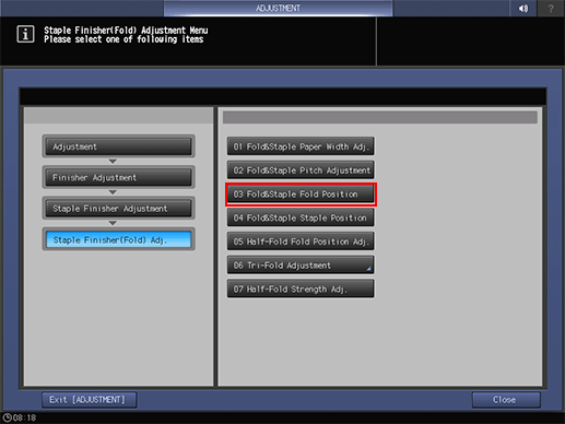 The screen returns to the Staple Finisher(Fold) Adjustment Menu screen.