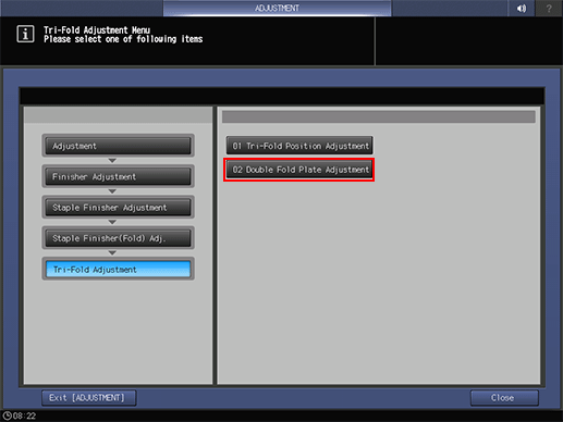 Press Finisher Adjustment, Staple Finisher Adjustment, Staple Finisher(Fold) Adj., Tri-Fold Adjustment, and Double Fold Plate Adjustment in sequence.