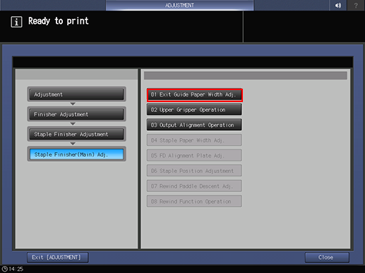 Press Finisher Adjustment, Staple Finisher Adjustment, Staple Finisher(Main) Adj., and Exit Guide Paper Width Adj. in sequence.