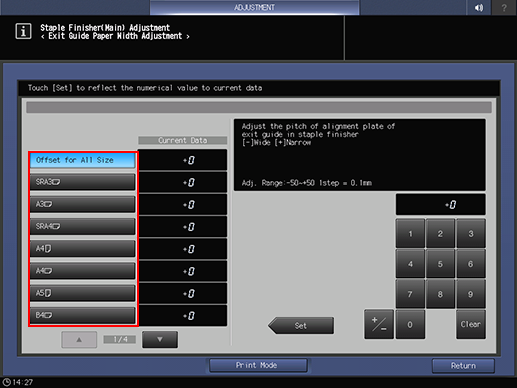 Objects of Adjustment: Offset for All Size, SRA3 short edge feed, A3 short edge feed, SRA4 short edge feed, A4 long edge feed, A4 short edge feed, A5 long edge feed, B4 short edge feed, B5 long edge feed, 8K short edge feed, 16K long edge feed, 12 18 short edge feed, 11 17 short edge feed, 9 11 long edge feed, 8.5 11 long edge feed, 8.5 11 short edge feed, 8.5 14 short edge feed, 8 13 short edge feed, 13 19 short edge feed, B5 short edge feed, A6 short edge feed / Postcard, SRA4 long edge feed, B6 short edge feed, 16K short edge feed, Custom(380~488 mm), Custom(220~379 mm), Custom(139~219 mm)