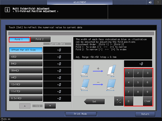 9. Select Fold 1, and then use the touch panel keypad to enter the set value.