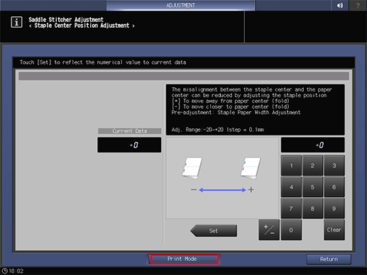 If any adjustment is required, press Exit PrintMode to return to the Staple Center Position Adjustment screen.