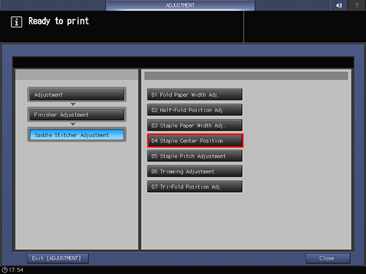 Press Finisher Adjustment, Saddle Stitcher Adjustment, and Staple Center Position in sequence.