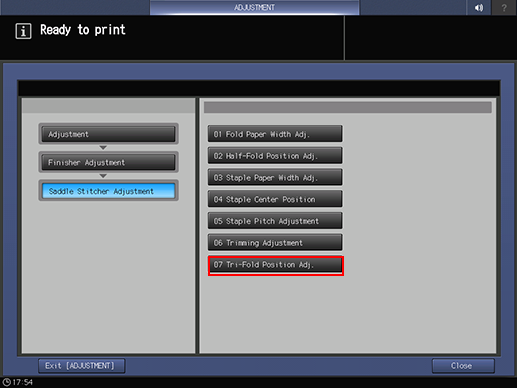2. Press Finisher Adjustment, Saddle Stitcher Adjustment, and Tri-Fold Position Adj. in sequence.