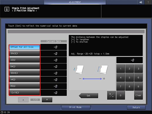 Objects of Adjustment: Offset for All Size, SRA3 short edge feed, A3 short edge feed, B4 short edge feed, SRA4 short edge feed, A4 short edge feed, B5 short edge feed, 12 18 short edge feed, 11 17 short edge feed, 8.5 14 short edge feed, 8.5 11 short edge feed, 8 13 short edge feed, 8K short edge feed, 16K short edge feed, Custom(380~488 mm), Custom(257~379 mm), 13 19 short edge feed