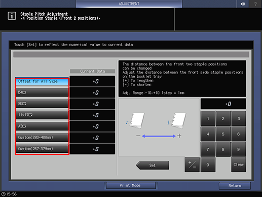 Objects of Adjustment: Offset for All Size, B4 short edge feed, 8K short edge feed, 11 17 short edge feed, A3 short edge feed, Custom(380~488 mm),, Custom(257~379 mm)