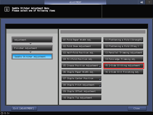 Press Finisher Adjustment, Saddle Stitcher Adjustment, and 2-Side Slitting Adjustment in sequence.