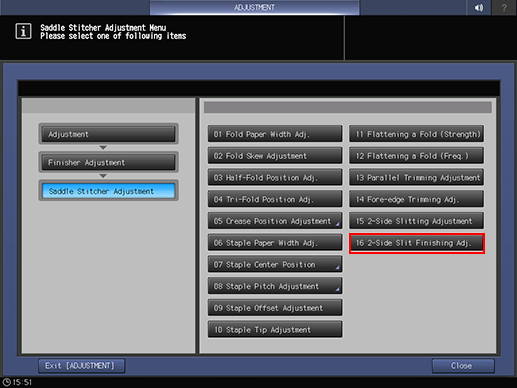 2. Press Finisher Adjustment, Saddle Stitcher Adjustment, and 2-Side Slit Finishing Adj. in sequence.