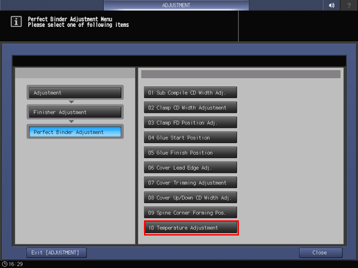 2. Press Finisher Adjustment, Perfect Binder Adjustment, and Temperature Adjustment in sequence.