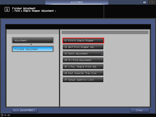 Press Finisher Adjustment and Fold & Staple Stopper in sequence.