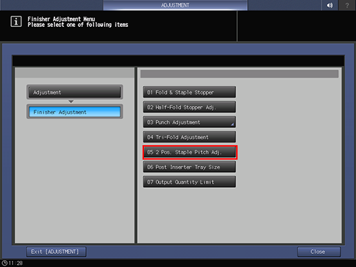2. Press Finisher Adjustment and 2 Pos. Staple Pitch Adj. in sequence.