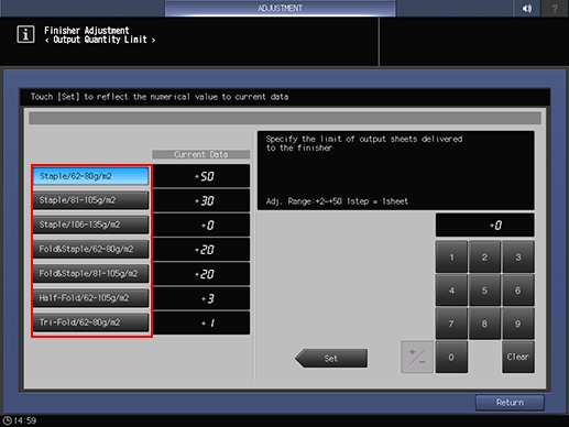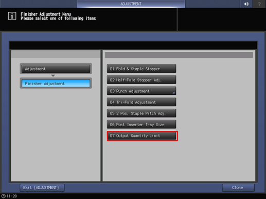 Press Finisher Adjustment and Output Quantity Limit in sequence.