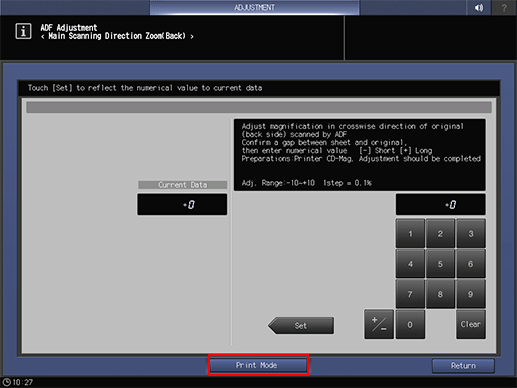 If any adjustment is required, press Exit PrintMode to return to the Main Scanning Direction Zoom(Back) screen.