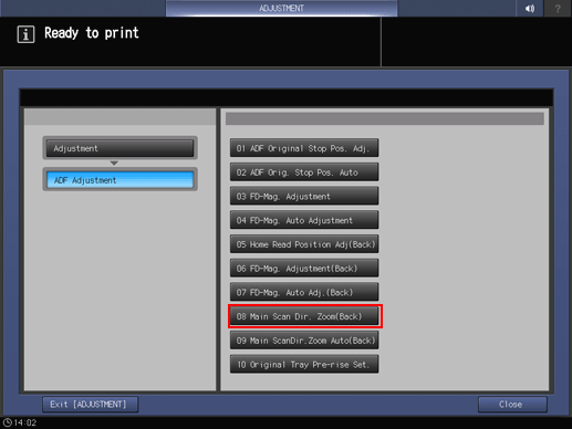 Press ADF Adjustment and Main Scan Dir. Zoom(Back) in sequence.