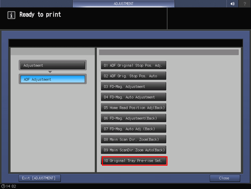 Press ADF Adjustment and Original Tray Pre-rise Set. in sequence.