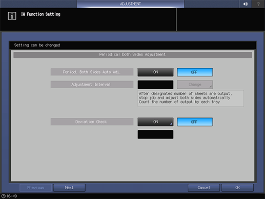 Period. Both Sides Auto Adj. | When data is printed out by the number of sheets specified in Adjustment Interval, you can select whether to periodically output charts and perform both sides adjustment. If ON is selected, you can set Periodical Adjustment to ON or OFF for each tray in the AutoMeasure tab of the Both Sides Adjust screen. |