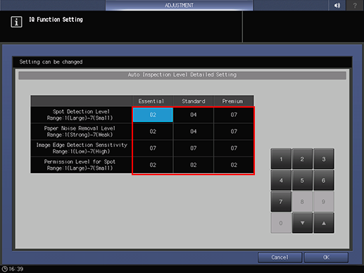 supplementary explanationWhen Image Controller IC-313, Image Controller IC-314, or Image Controller IC-417 is installed on the machine, Level Setting is displayed. Select Essential, Standard, or Premium to specify the level for each item.