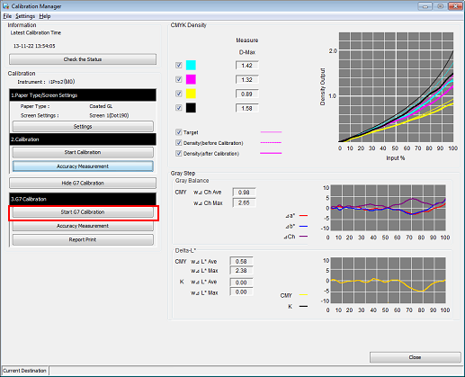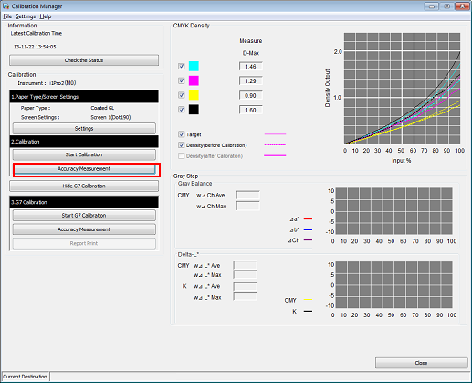 7. Check the measurement results (CMYK density and Gray Step) on the Calibration Manager screen.