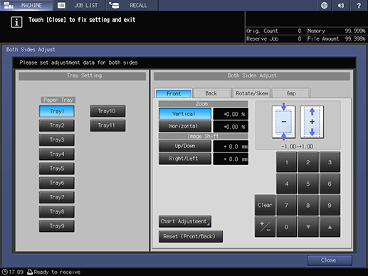 Press Both Sides on the MACHINE screen to display the Both Sides Adjust screen. You can also display the screen from the Paper Setting screen by pressing the Paper Setting in the MACHINE screen or the COPY screen.