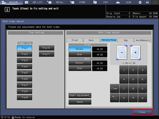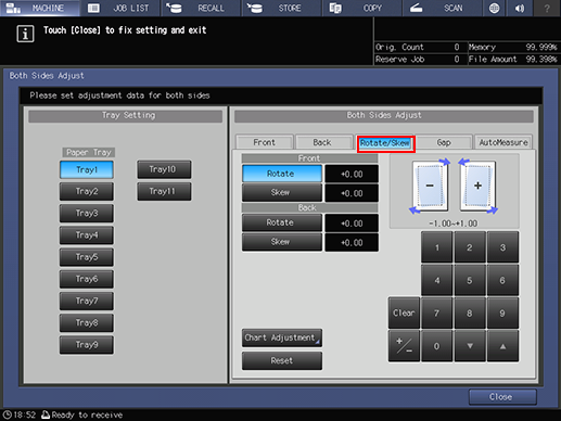 If UTILITY - User Setting - Common Setting - Both Sides Rotate/Skew (UTILITY - Administrator Setting - Common Setting - Both Sides Rotate/Skew) is set to Disable, the Rotate/Skew adjustment is not available. To perform the Rotate/Skew adjustment, set Both Sides Rotate/Skew to Enable.