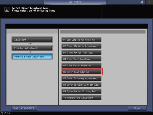 Press Perfect Binder Adjustment on the Finisher Adjustment menu.