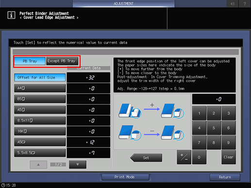 When the left cover paper edge is misaligned against the body sets in perfect binding, this function allows you to adjust the left cover paper edge position by specifying the desired value.